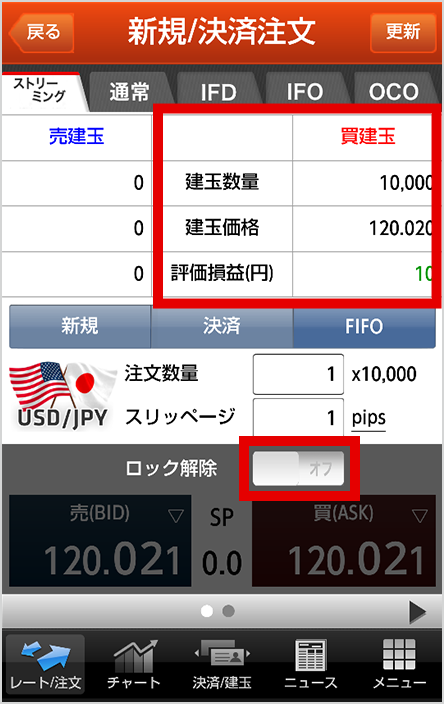 • [設定]メニューで初期値設定を変更しても、ストリーミング画面ではFIFO注文が初期設定となります。両建て取引をする場合は、その都度、取引の種類を「新規」に変更してください。