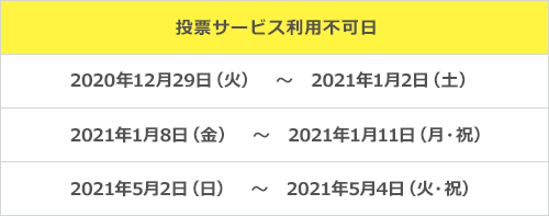 - ※一部の投票サービスについては、オンラインサービス停止期間前に会員登録や投票資金を入金することで、オンライン停止期間中も各投票サイトより投票が可能です。