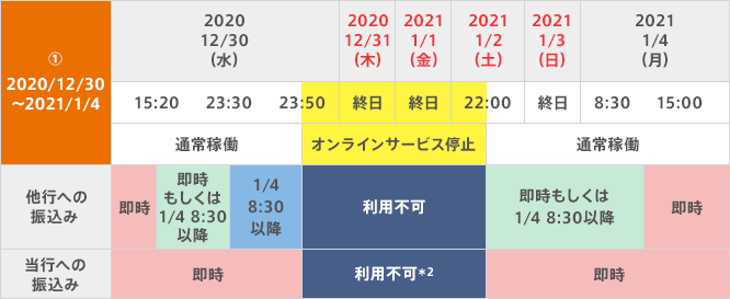 当行は2021年1月8日23時50分から1月11日22時までオンラインサービス停止期間中のため、2021年1月8日23時49分までにご準備いただくことをおすすめします。