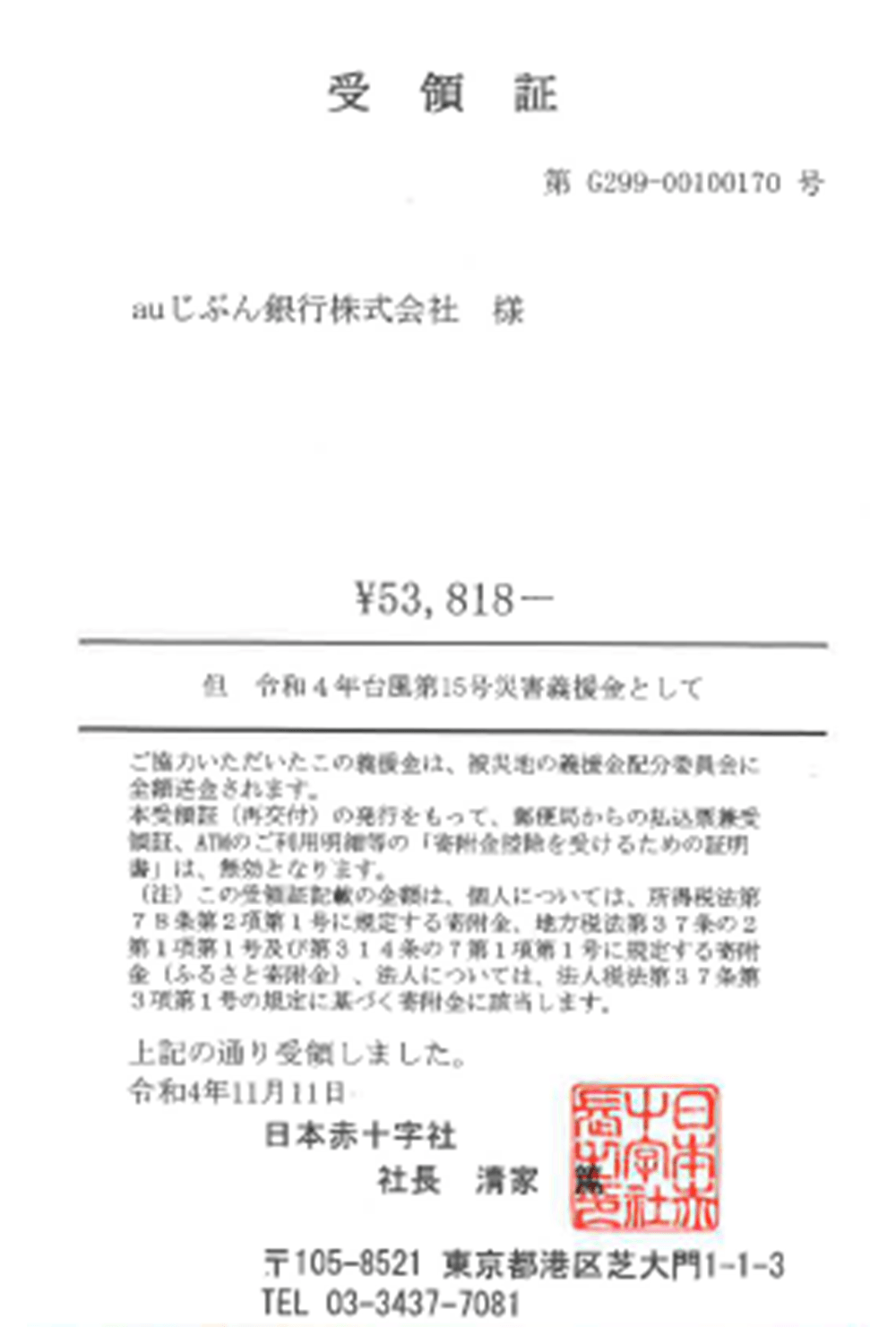 日本赤十字社を通じて寄付しました。