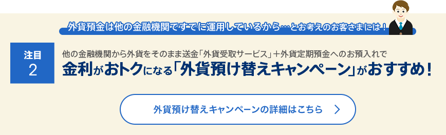 [注目②:外貨預金は他の金融機関ですでに運用しているから…とお考えのお客さまには!]他の金融機関から外貨をそのまま送金「外貨受取サービス」+外貨定期預金へのお預入れで金利がおトクになる「外貨預け替えキャンペーン」がおすすめ!外貨預け替えキャンペーンの詳細はこちら。