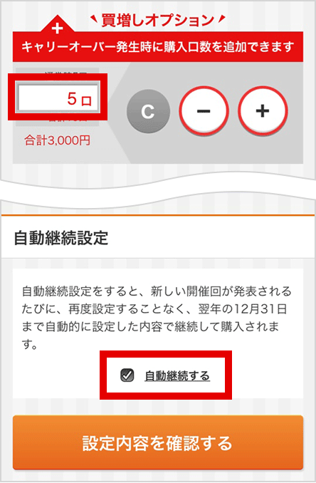 キャリーオーバー発生時に購入口数を追加したい場合は、「買増しオプション」に追加口数を入力します。