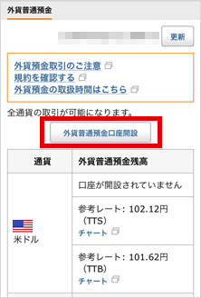 - ※外貨定期預金の口座開設をご希望の場合は、外貨定期預金のメニューよりお進みください。外貨定期預金作成時に、外貨普通預金の同時開設が可能です。