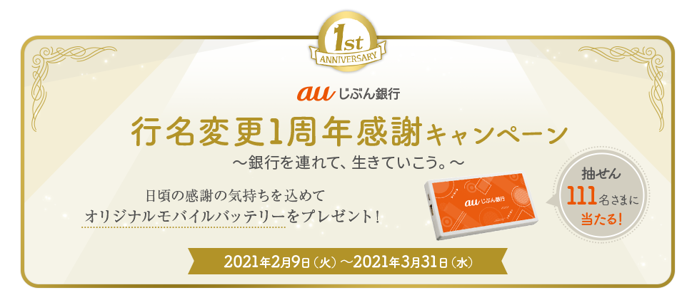auじぶん銀行の新しい支店名に関するクイズに正解されたお客さまの中から、抽せんで111名さまにauじぶん銀行オリジナルモバイルバッテリーをプレゼントいたします。