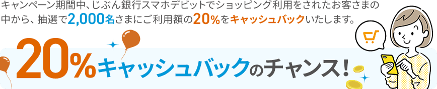 対象期間中、じぶん銀行スマホデビットでショッピング利用をされたお客さまの中から、抽選で2,000名さまにご利用金額の20%をキャッシュバック