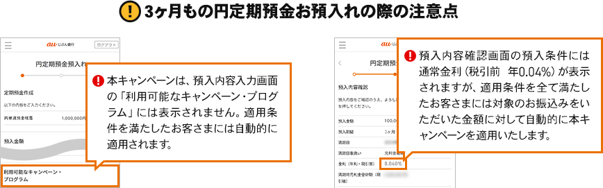 - 定期預金作成画面の預入条件に記載の金利は通常金利(税引前 年0.04%)となっていますが、適用条件を全て満たしたお客さまには、期間中にお預入れいただいた3ヶ月もの円定期預金のうち、お客さまご本人名義の他金融機関からお振込みいただいた合計金額を超えない金額に対して、自動的に本キャンペーンが適用されます。