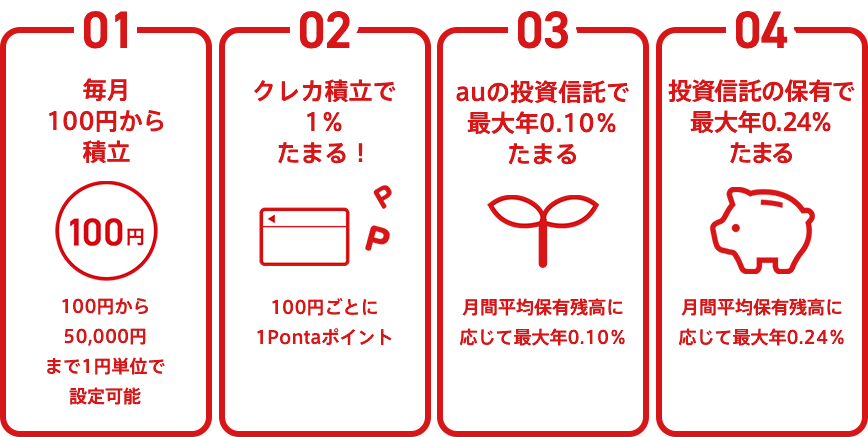 - ※au PAY カード決済による投資信託の積立で還元するPontaポイント数は月間最大500Pontaポイントとなります。