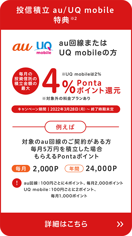 - ※au PAY カード決済による投資信託の積立で還元するPontaポイント数は月間最大500Pontaポイントとなります。
