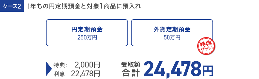 期間中の各商品への合計預入金額によって特典金額が決定します。