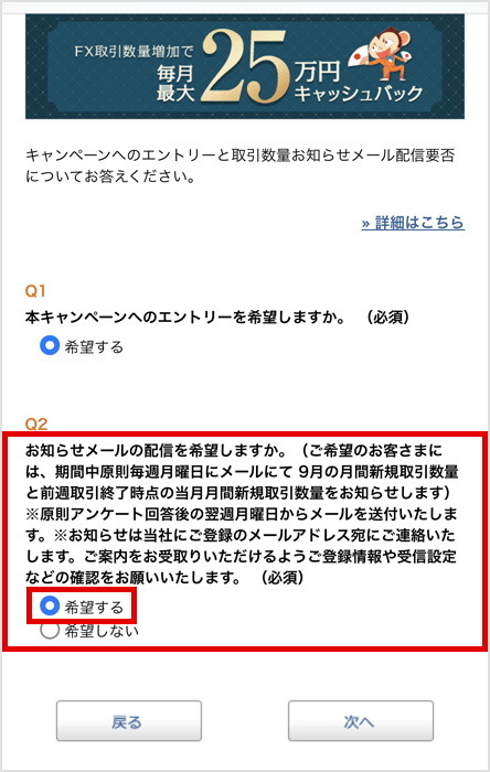 エントリー時に回答いただくアンケート内のお知らせメールの配信要否を確認する設問にて、「希望する」と回答されたお客さまには、9月の月間新規取引数量と前週取引終了時点の当月月間新規取引数量をメールにてご連絡いたします。
