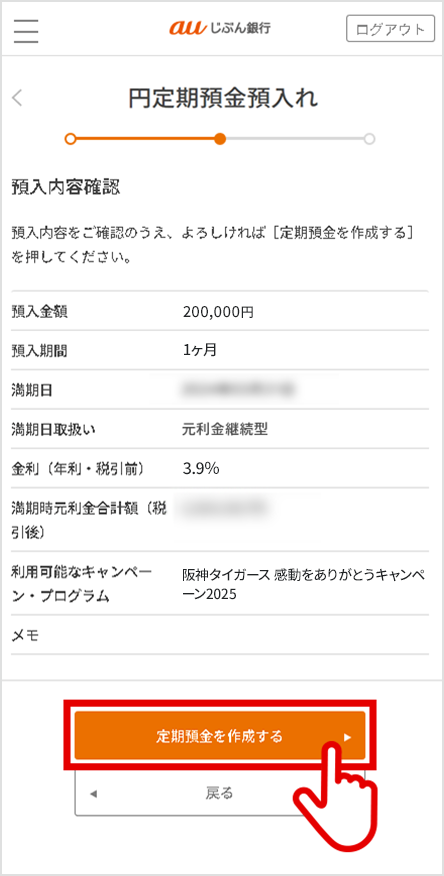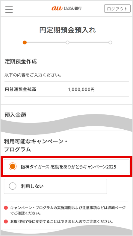 お取引時に表示される[利用可能なキャンペーン・プログラム]にて【阪神タイガース 感動をありがとうキャンペーン2025】を選択いただくことで、キャンペーン金利を適用いたします。 -
