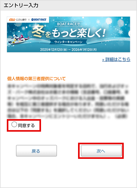 キャンペーンページのエントリーボタンを押してログイン後、「BOAT RACEで冬をもっと楽しく!ウィンターキャンペーン」を選んでエントリーボタンを押す