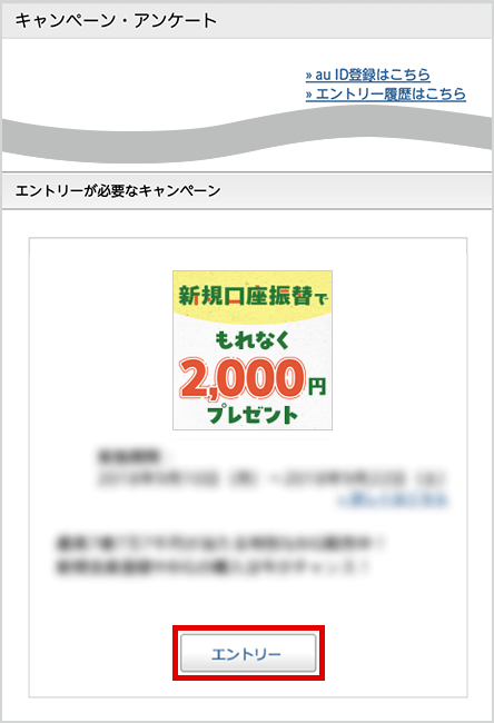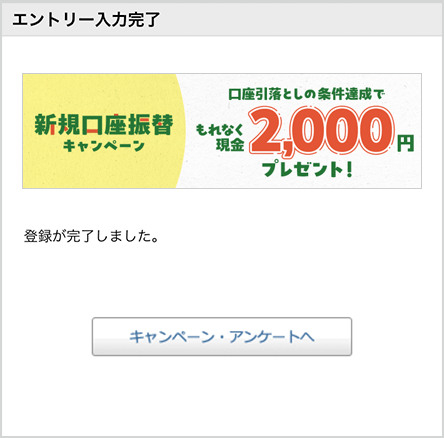 キャンペーンページのエントリーボタンを押してログイン後、「新規口座振替キャンペーン」を選んでエントリーボタンを押す