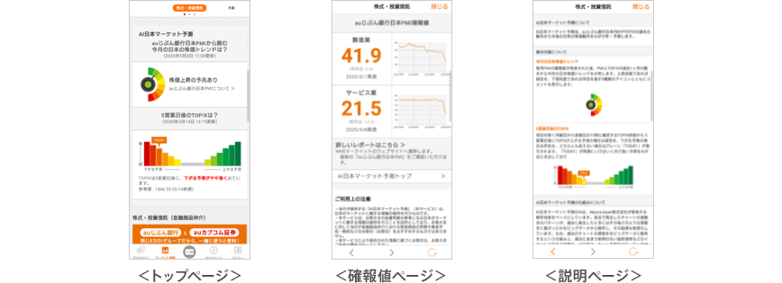 auじぶん銀行株式会社(本社:東京都中央区、代表取締役社長:臼井 朋貴、以下 auじぶん銀行)は、2020年5月20日から、「auじぶん銀行日本PMI」(以下 日本PMI)や人工知能(以下 AI)、日本の株価の過去推移を使って、今後のTOPIX(東証株価指数、以下 TOPIX)を分析・予測する「AI日本マーケット予測」(以下 本サービス)の提供を開始します。