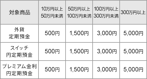 対象商品ごとのお預入金額に応じて、それぞれ下記金額の現金をプレゼントします。