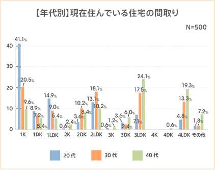続いて、部屋の間取りについて調査しました。まず、現在住んでいる間取りについて聞いたところ、20代・30代では「1K」、40代では「3LDK」が最も多く、ライフステージに合わせて住環境を変えている様が見て取れます。