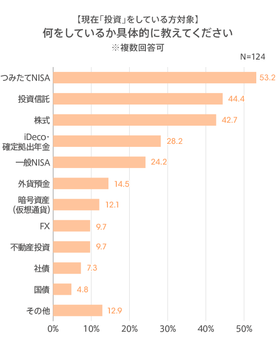 次に、円安や物価高騰の対策として投資をしている人に、具体的に何をしているか質問したところ、1位「つみたてNISA(53.2%)」、2位「投資信託(44.4%)」、3位「株式(42.7%)」という結果になりました【図13】。