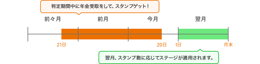 判定期間中、年金のお受取が1円以上あった場合、入金のカテゴリにおいてスタンプを1個付与いたします。