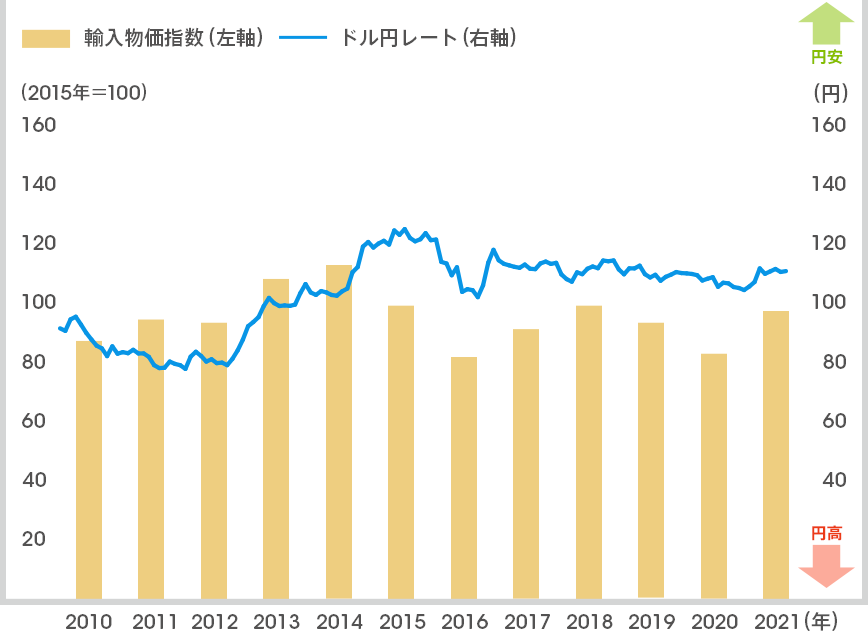 毎日の生活の中で為替相場の変動を実感するのは、輸入品の値段が上下するときでしょう。日本はエネルギー資源の9割、食料の6割ほどを輸入に頼っているため、為替相場が円安方向に動く(円の価値が下がる=外貨の価値が上がる)と、ガソリン価格や小麦を代表とする食品価格が上昇を始めます。例えば、2012年から2014年の3年間は、消費税増税の影響に加え、輸入品の場合には、その3年の間に1ドル80円から120円まで円安が進んだ影響もあり、消費者物価や輸入物価が急上昇しました。