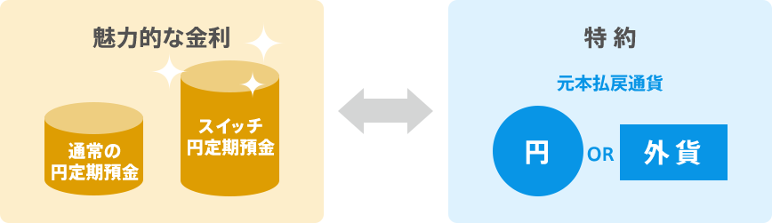 スイッチ円定期預金は、「円」でお預入れいただき「円」で利息をお受取いただきます。ただし、元本は「円」もしくは「外貨」で払戻しとなります(お客さまによる選択はできません)。