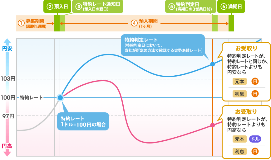 預入後に当社が設定する特約レートと特約判定日(満期日3営業日前)の実勢為替レートを比較して、満期時の元本のお受取通貨が決定します。実勢為替レートが特約レートより円安もしくは同値となった場合は円で、円高となった場合は外貨で払戻します。