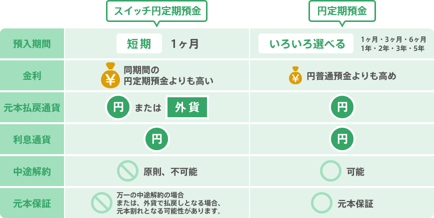 スイッチ円定期預金は、「円」でお預入れいただき「円」で利息をお受取いただきます。ただし、元本は「円」もしくは「外貨」で払戻しとなります(お客さまによる選択はできません)。