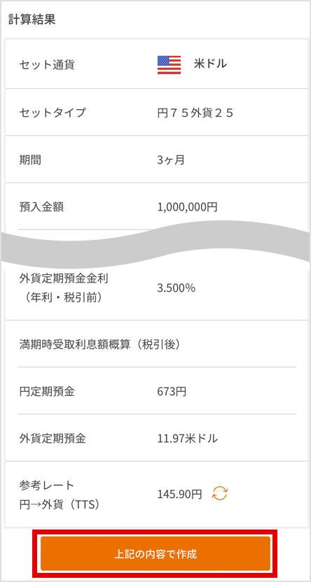 通貨:米ドル セットタイプ:円25外貨75 期間:3ヶ月 預入金額:100万円