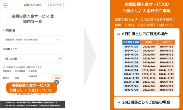 定額自動入金サービスをご利用中のお客さまに対し、入金スケジュールをポップアップで表示しました!