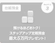 | 特典内容 | 仕組預金「ステップアップ定期預金」への合計預入額100万円ごとに1,000円、最大で5万円プレゼント!