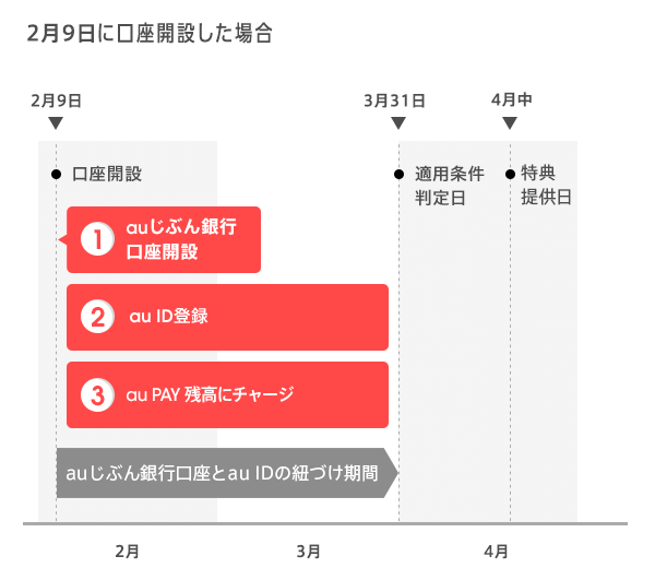 - auじぶん銀行に登録のau IDが「登録済」且つ「有効」でない場合、au IDが解約されている場合、auじぶん銀行口座が解約されている場合は、特典対象外となります。