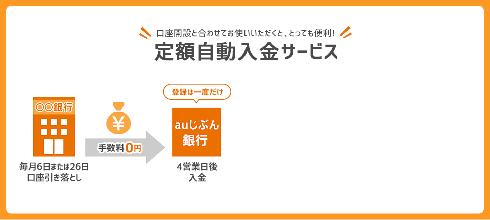 定額自動入金サービスは、お客さまご本人名義の他行口座から、毎月一定額をauじぶん銀行口座に入金できるサービスです。給与振込口座からの振込みやATMで入金する手間が省け、auのご利用料金(au PAY カードのご利用代金)のお支払いにとっても便利。au PAY カードの代金引き落としのご準備にご利用いただく場合、引き落とし日は26日のご指定をおすすめします。残高不足で引き落としがされなかったなど、万一の時も安心です。