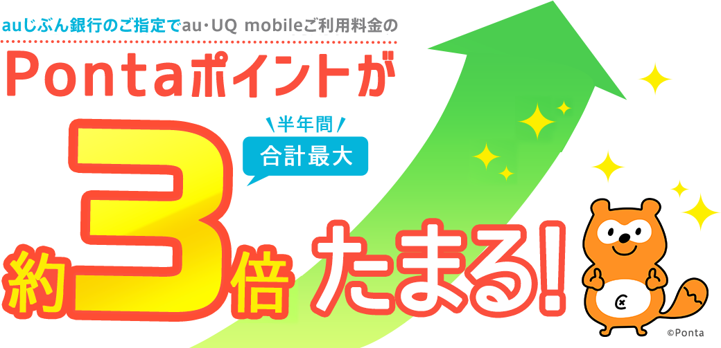 ポイント約3倍の内訳は、au・UQ mobileご利用料金*に対して「au PAY カードのお支払いポイント提供(100円(税込)ごとに1P)」+「“auじぶん銀行をご指定で6ヶ月間au・UQ mobileご利用料金分のポイントがもれなく合計2倍!”【ポイント2倍】ポイント提供(100円(税込)ごとに1P)」+「【ポイント3倍】ポイント提供(100円(税込)ごとに1P)」となります。