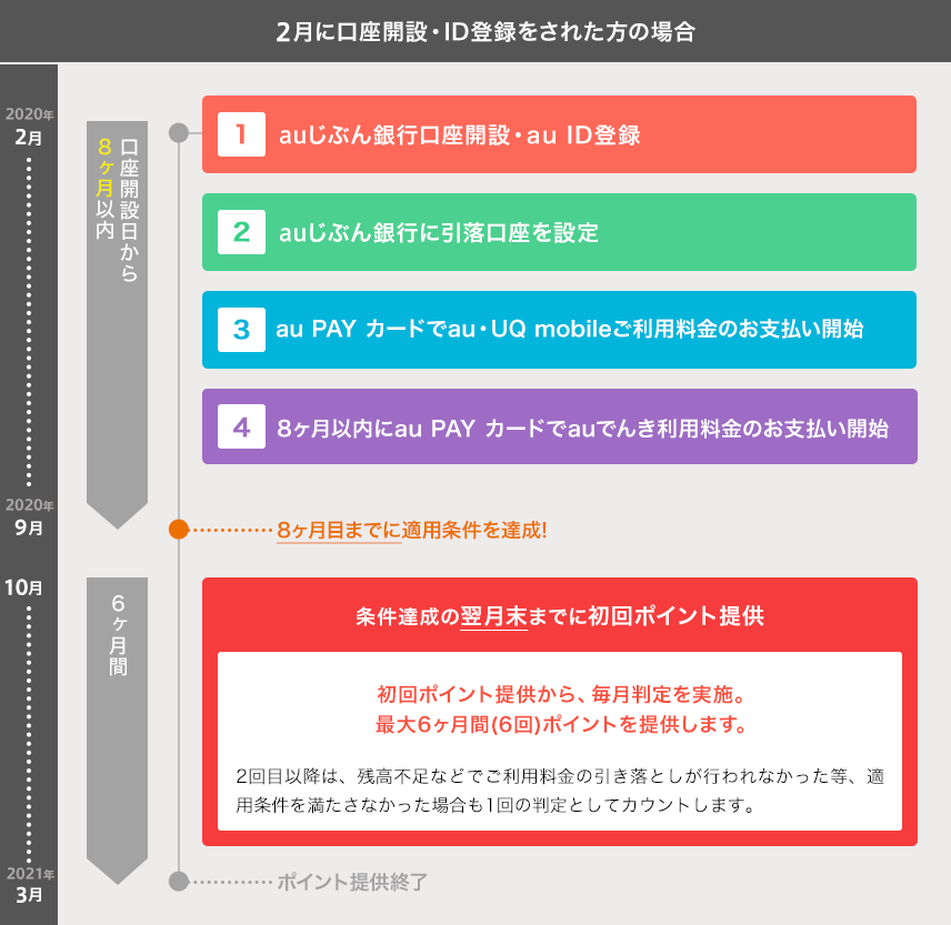 - 口座開設から5ヶ月以内(注3)に、auじぶん銀行をお支払口座(引落口座)に設定した(注4)au PAY カードでau・UQ mobileご利用料金(注6)のお支払いを開始し、且つ引落日にお支払い(注8)いただくこと