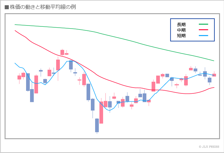 株価や外国為替のテクニカル分析で使用される指標で、過去の一定期間の株価の平均値を連続して計算し、これをグラフ化したもの。中・長期的なトレンドを表すもので、期間のとりかたは、日足では5日、25日、75日、週足では13週、26週、月足では12カ月、24カ月などがよく用いられます。これらの線の動きと現在の株価を合わせてみて、株価のトレンドや転換点などを分析するのに利用されます。