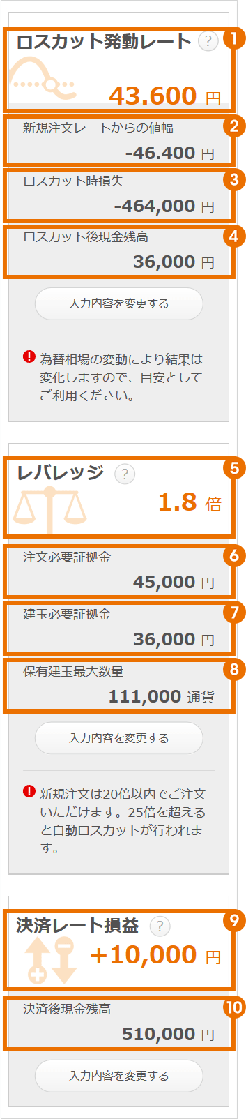 ご入力いただいた決済レートで決済取引が約定した場合に生じる損失および利益が表示されます。