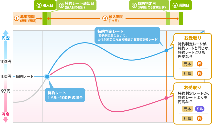 預入日の実績為替レートを元に、特約レートを設定しますので、募集締切日に近い日にお申込みいただくと、より特約レートの予想がつきやすい商品です。