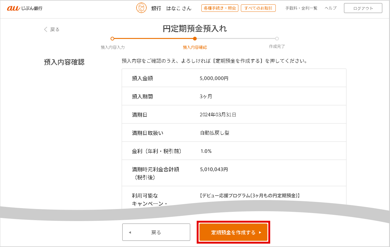 お取引時に表示される【利用可能なキャンペーン・プログラム】にて【デビュー応援プログラム(3ヶ月もの円定期預金)】を選択してください。