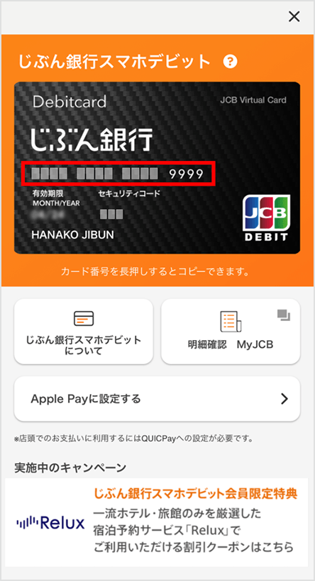※システムメンテナンスの時間帯は、じぶん銀行スマホデビットのカード情報をご確認いただくことができませんのでご注意ください。