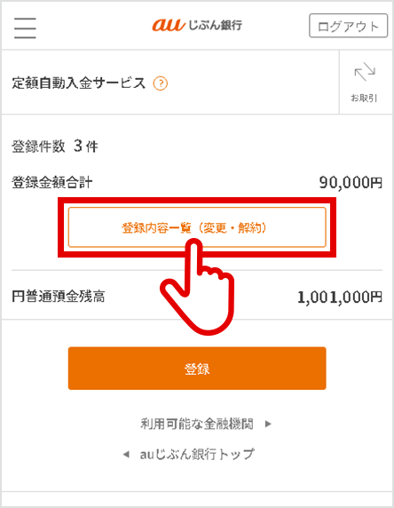 スマートフォンまたはパソコンからログインし、「定額自動入金サービス」メニューの登録内容一覧(変更・解約)からご確認ください。
