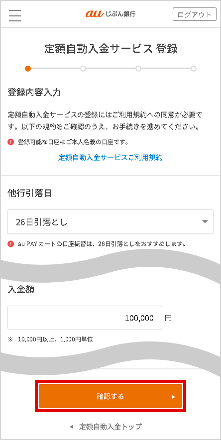 規約を確認し、引落日と入金額を入力。[確認する]を選択