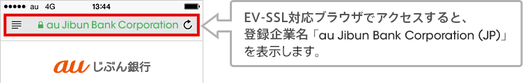 auじぶん銀行のインターネットバンキングは、DigiCert, IncのEV SSL証明書を採用し、正規のページであることを確認できるようにしています。